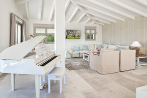 Das Innere der Villa ist geschmackvoll eingerichtet, wobei der Schwerpunkt auf offenem Wohnen liegt. Der Wohn- und Essbereich ist mühelos mit einer offenen Küche mit Frühstücksbar im Obergeschoss verbunden. Dieses Design fördert das Gefühl von Offenheit und macht die Unterhaltung einfach.