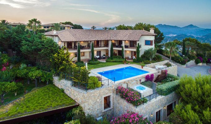 Das Grundstück umfasst 1.325 Quadratmeter, der Wohnraum verteilt sich auf drei Ebenen. Im Erdgeschoss liegt der Garten mit Pool, während die Dachterrasse mit Holzdeck einen Panoramablick auf die malerische Hügellandschaft und die Bucht von Cala Llamp bietet. Dank der Lage und Ausrichtung der Villa können Sie von hier auch wunderbare Sonnenuntergänge beobachten. Zudem verfügt die Villa über fünf Schlafzimmer, einen Fitness-/Saunabereich, Büroräume, ausreichend Platz für sechs Fahrzeuge (vier Innen- und zwei Außenstellplätze) sowie ein Gästehaus mit separatem Apartment.