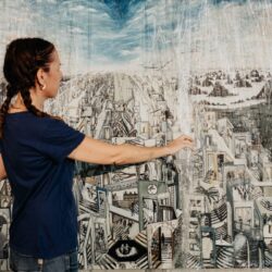 Sally erzählt uns, wie das riesige Gemälde in das verschlungene Labyrinth der Existenz eintaucht und nach einer Ordnung im Chaos sucht. Es stellt das dynamische Wechselspiel zwischen Licht und Schatten, Tod und Geburt und das „Labyrinth des Lebens” dar, in dem wir alle leben. „Ich wusste, dass es ein Prozess des Lebens ist. Ich habe es am Leben erhalten, weil ich mit dem Bild gewachsen bin”, erklärt sie. „Das Auf und Ab, das Rein und Raus von Türen, das Überqueren von Brücken. Der Wechsel von Chaos und Angst zu Mitgefühl und Freude, zu Frieden und Wachstum.”